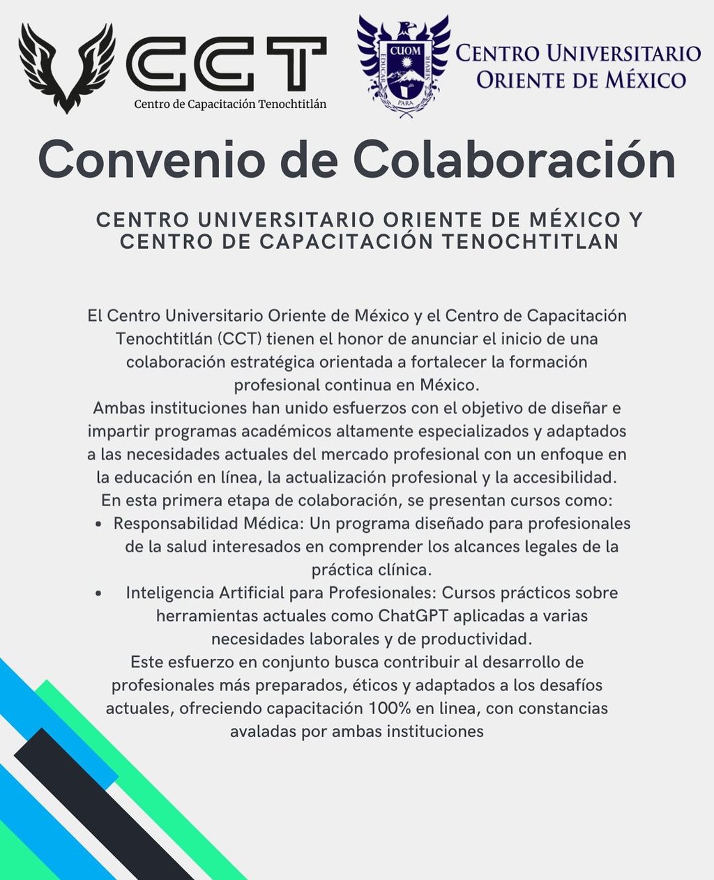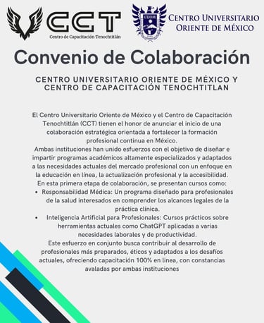 Desde el CCT anunciamos con orgullo nuestra alianza con el Centro Universitario Oriente de México (CUOM), una colaboración que nos permite ampliar el impacto de nuestra misión: formar profesionales competentes y preparados para los retos actuales.